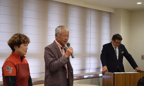 表彰式で優勝スピーチをする今森様(JCCC会員)ご夫婦のペア